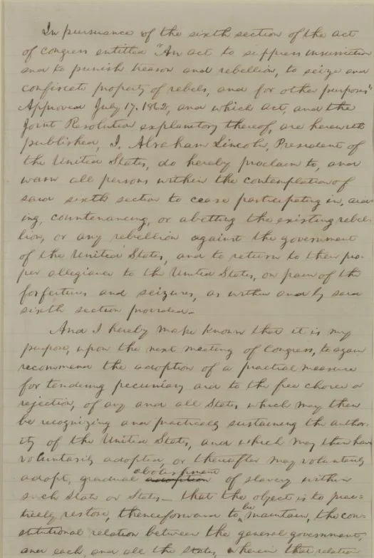 În iulie 1862, Lincoln și-a informat cabinetul că va emite o proclamație de emancipare, dar care nu va include statele de frontieră, care dețineau sclavi, dar rămăseseră loiale Uniunii. Cabinetul său l-a convins să nu facă anunțul decât după o victorie a Uniunii. Oportunitatea lui Lincoln a venit în urma victoriei Uniunii în bătălia de la Antietam din septembrie 1862. Pe 22 septembrie, președintele a emis proclamația care declara liberi toți sclavii din toate statele Confederației care nu aveau să treacă sub controlul Uniunii până pe 1 ianuarie 1863.